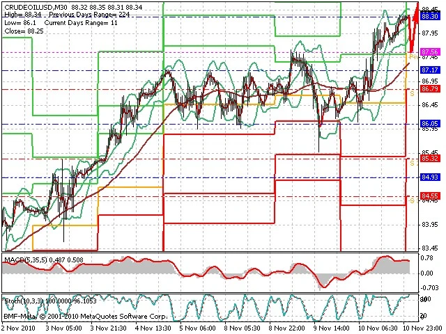 Očekáváme vývoj LONG, případné vstupy do obchodu z hladiny 87.55 s předpokládaným cílem 88.25 až 90. Proražení hladiny 87.55 může vést k pohybu s pravděpodobným cílem 86.8 až 86.