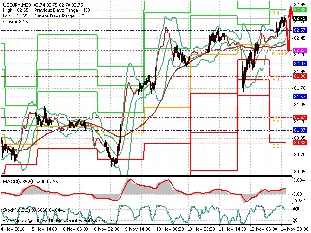 Předpokládaný pohyb pro dnešní den LONG. Případné vstupy do obchodu z hladiny 82.26 s předpokládaným cílem 82.65, případně až 82.8. Při proražení hladiny 82 se otevře cesta k 81.9 až 81.55.