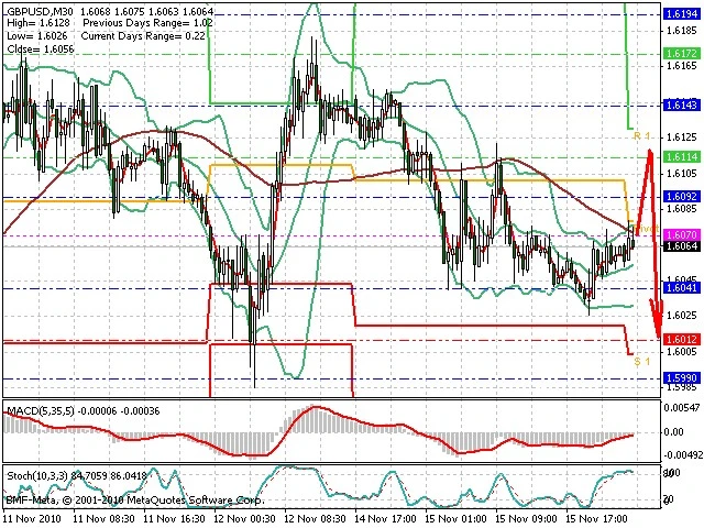 Očekáváme vývoj SHORT, případné vstupy do obchodu z hladiny 1.61 s předpokládaným cílem 1.602 až 1.5955. Proražení hladiny 1.61 může vést k pohybu s pravděpodobným cílem 1.6175 až 1.624.