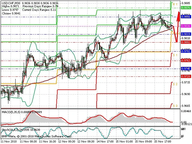 Předpokládaný pohyb pro dnešní den LONG z hladiny 0.98 s předpokládaným cílem 0.9875, případně až 0.9912. Alternativní proražení hladiny 0.98 může vést k pohybu s pravděpodobným cílem 0.976 až 0.9725.