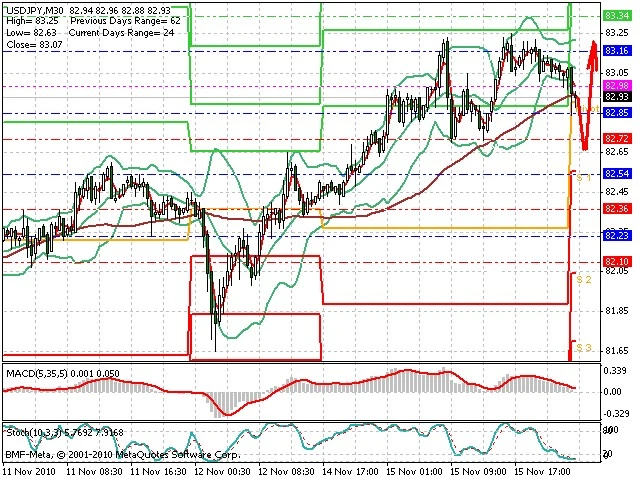 Předpokládaný pohyb pro dnešní den LONG. Případné vstupy do obchodu z hladiny 82.65 s předpokládaným cílem 83.25, případně až 83.55. Při proražení hladiny 82.65 se otevře cesta k 82.35 až 82.1.
