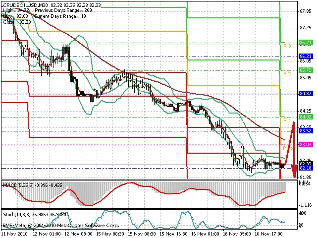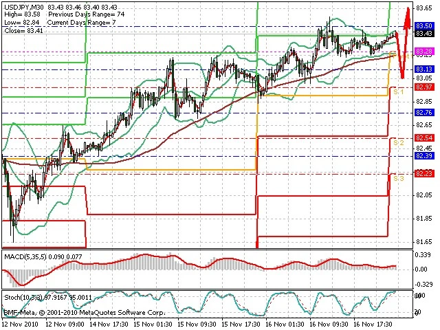 Předpokládaný pohyb pro dnešní den LONG. Případné vstupy do obchodu z hladiny 83.05 s předpokládaným cílem 83.4, případně až 83.6. Při proražení hladiny 83.0 se otevře cesta k 82.7 až 82.35.