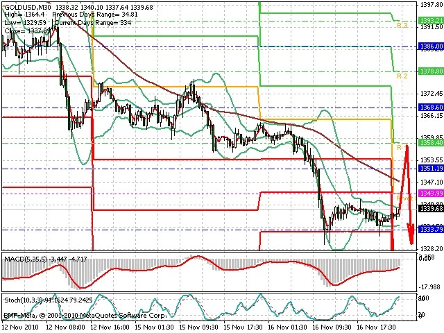Předpokládaný pohyb pro dnešní den LONG. Případné vstupy do obchodu z hladiny 1 345 s předpokládaným cílem 1 365, případně až 1 376. Při proražení hladiny 1 345 se otevře cesta k 1 330 až 1 320.
