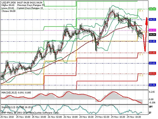 Předpokládaný pohyb pro dnešní den LONG. Případné vstupy do obchodu z hladiny 83.85 s předpokládaným cílem 84.4, případně až 84.6. Proražení hladiny 83.8 může vést k pohybu s pravděpodobným cílem 83.5 až 83.3.