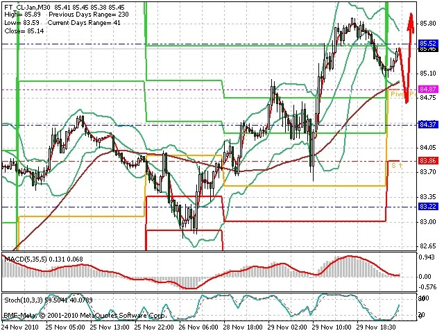 Předpokládaný pohyb pro dnešní den LONG. Případné vstupy do obchodu z hladiny 84.7 s předpokládaným cílem 86.0, případně až 86.5. Proražení hladiny 84.7 může vést k pohybu s pravděpodobným cílem 83.5 až 82.8.