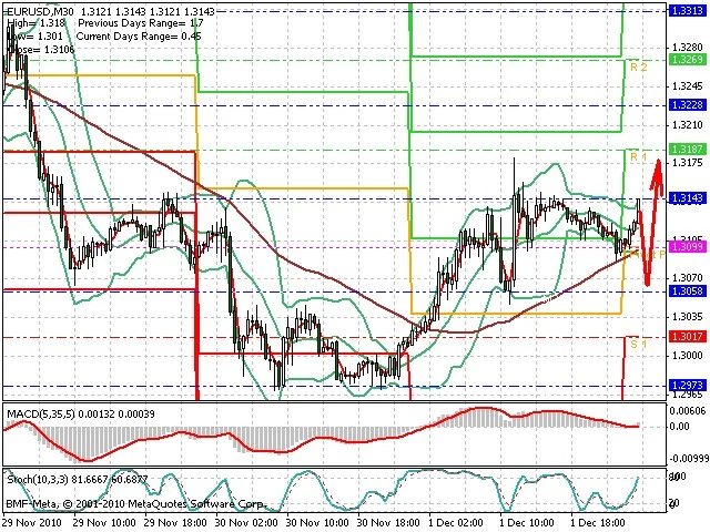 Předpokládaný pohyb pro dnešní den LONG. Případné vstupy do obchodu z hladiny 1.3065 s předpokládaným cílem 1.3185, případně až 1.325. Proražení hladiny 1.3055 může vést k pohybu s pravděpodobným cílem 1.3015 až 1.295.