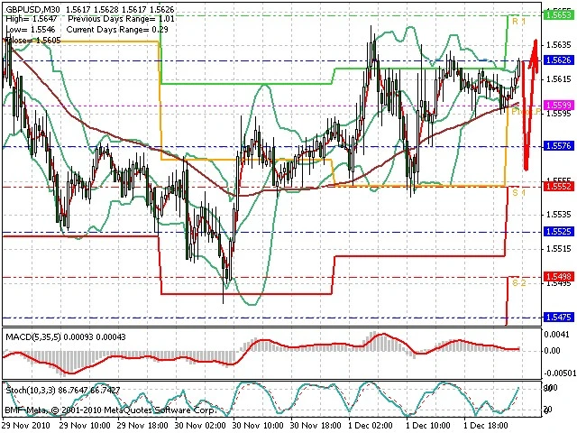Předpokládaný pohyb pro dnešní den LONG. Případné vstupy do obchodu z hladiny 1.556 s předpokládaným cílem 1.565, případně až 1.5695. Proražení hladiny 1.555 může vést k pohybu s pravděpodobným cílem 1.552 až 1.5485.
