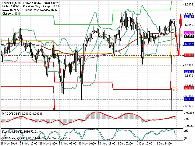 Předpokládaný pohyb pro dnešní den LONG. Případné vstupy do obchodu z hladiny 1.00 s předpokládaným cílem 1.007, případně až 1.012. Proražení hladiny 1.00 může vést k pohybu s pravděpodobným cílem 0.9955 až 0.9925.