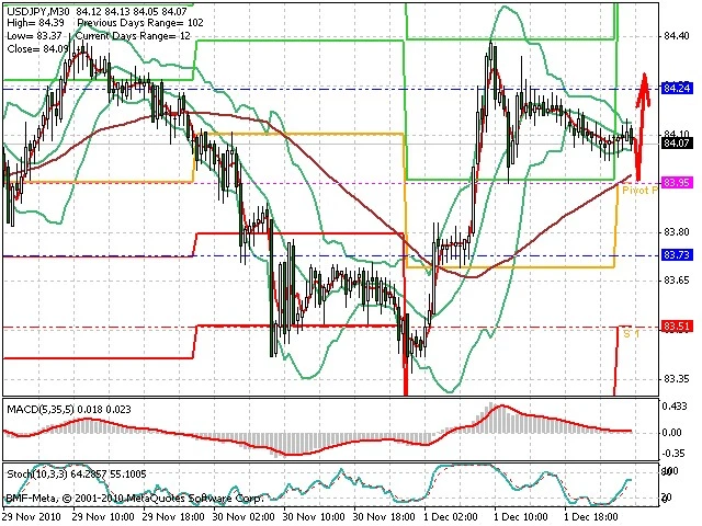Předpokládaný pohyb pro dnešní den LONG. Případné vstupy do obchodu z hladiny 83.95 s předpokládaným cílem 84.4, případně až 84.6. Proražení hladiny 83.9 může vést k pohybu s pravděpodobným cílem 83.7 až 83.55.