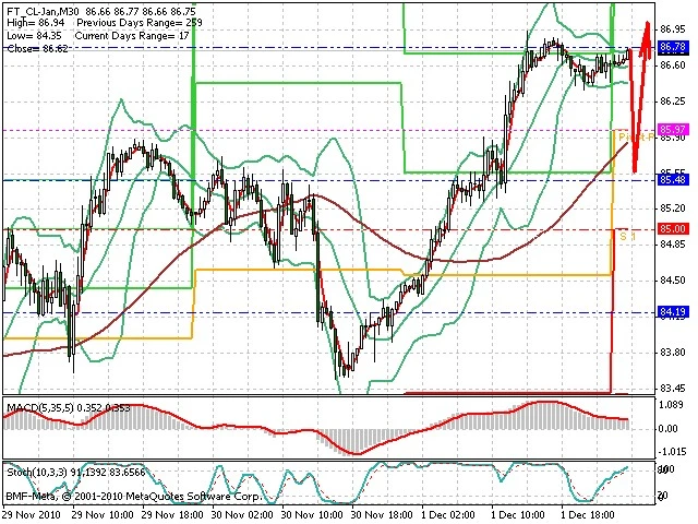 Předpokládaný pohyb pro dnešní den LONG. Případné vstupy do obchodu z hladiny 85.55 s předpokládaným cílem 87.2, případně až 88. Proražení hladiny 85.55 může vést k pohybu s pravděpodobným cílem 84.65 až 83.5.