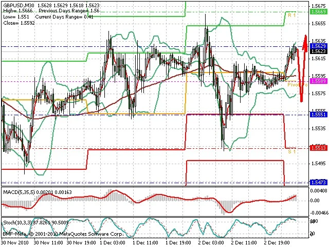 Předpokládaný pohyb pro dnešní den LONG. Případné vstupy do obchodu z hladiny 1.556 s předpokládaným cílem 1.567, případně až 1.574. Proražení hladiny 1.555 může vést k pohybu s pravděpodobným cílem 1.551 až 1.548.