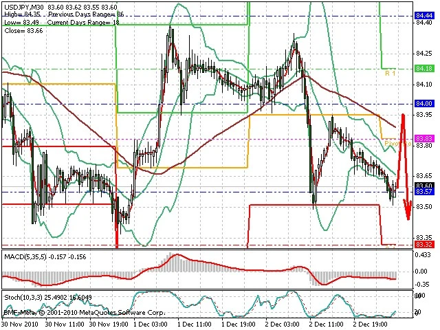 Předpokládaný pohyb pro dnešní den SHORT. Případné vstupy do obchodu z hladiny 83.95 s předpokládaným cílem 83.5, případně až 83.38. Proražení hladiny 84.0 může vést k pohybu s pravděpodobným cílem 84.2 až 84.4.