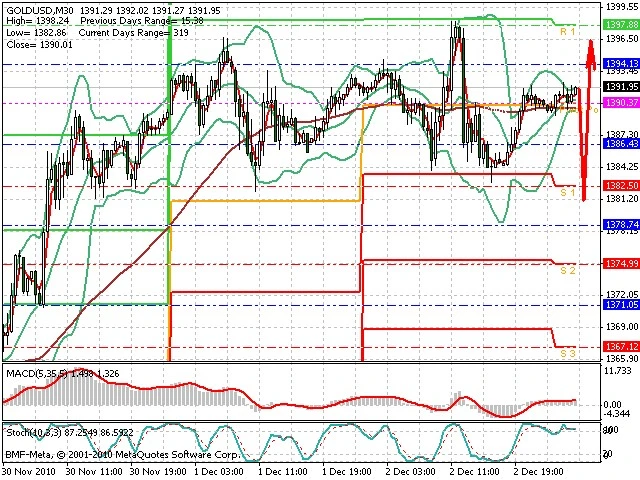Předpokládaný pohyb pro dnešní den LONG. Případné vstupy do obchodu z hladiny 1 380 s předpokládaným cílem 1 400, případně až 1 410. Proražení hladiny 1 380 může vést k pohybu s pravděpodobným cílem 1 365 až 1 354.