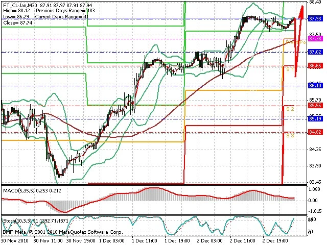 Předpokládaný pohyb pro dnešní den LONG. Případné vstupy do obchodu z hladiny 86.35 s předpokládaným cílem 88.3, případně až 89. Proražení hladiny 86.35 může vést k pohybu s pravděpodobným cílem 85.9 až 85.