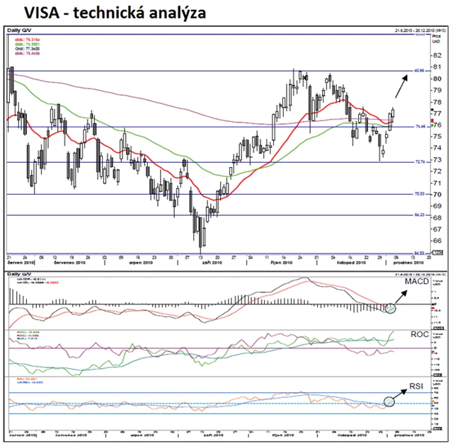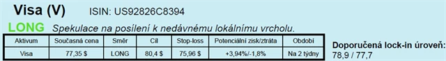 Očekáváme, že akcie Visa během následujících dní nad současnou úroveň dále posílí potenciálně až k 80 USD.