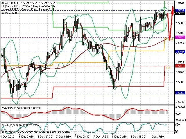 Předpokládaný pohyb pro dnešní den LONG. Případné vstupy do obchodu z hladiny 1.577 s předpokládaným cílem 1.5895, případně až 1.595. Proražení hladiny 1.576 může vést k pohybu s pravděpodobným cílem 1.572 až 1.566.