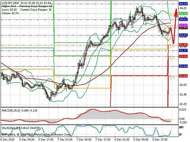 Předpokládaný pohyb pro dnešní den LONG. Případné vstupy do obchodu z hladiny 83.5 s předpokládaným cílem 84.05, případně až 84.4. Proražení hladiny 83.45 může vést k pohybu s pravděpodobným cílem 83.2 až 83.