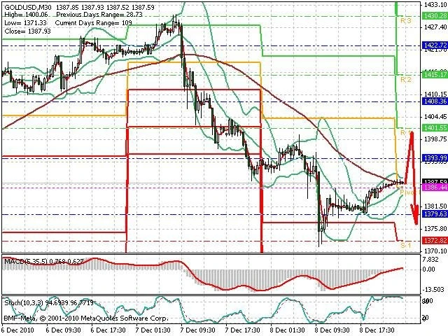 Předpokládaný pohyb pro dnešní den SHORT. Případné vstupy do obchodu z hladiny 1 400 s předpokládaným cílem 1 365, případně až 1 352. Proražení hladiny 1 400 může vést k pohybu s pravděpodobným cílem 1 411 až 1 425.