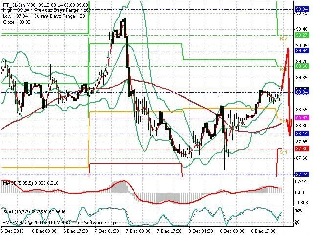 Předpokládaný pohyb pro dnešní den SHORT. Případné vstupy do obchodu z hladiny 90.0 s předpokládaným cílem 87.0, případně až 85.9. Proražení hladiny 90 může vést k pohybu s pravděpodobným cílem 91.8 až 93.4.