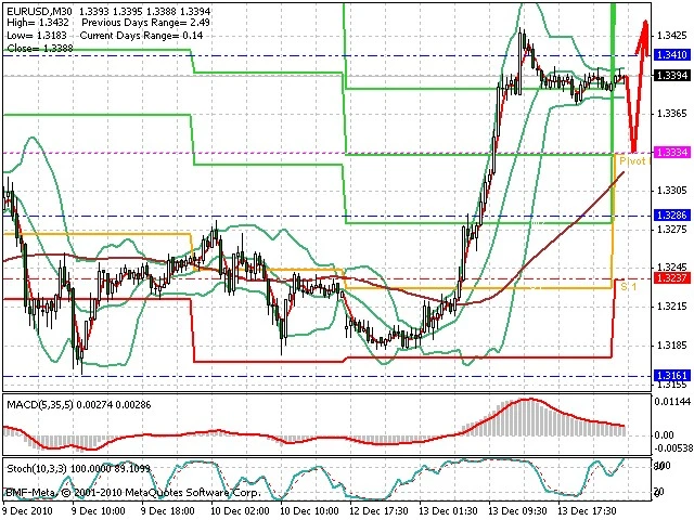 Předpokládaný pohyb pro dnešní den LONG. Případné vstupy do obchodu z hladiny 1.3335 s předpokládaným cílem 1.344, případně až 1.35. Proražení hladiny 1.3325 může vést k pohybu s pravděpodobným cílem 1.3275 až 1.3225.