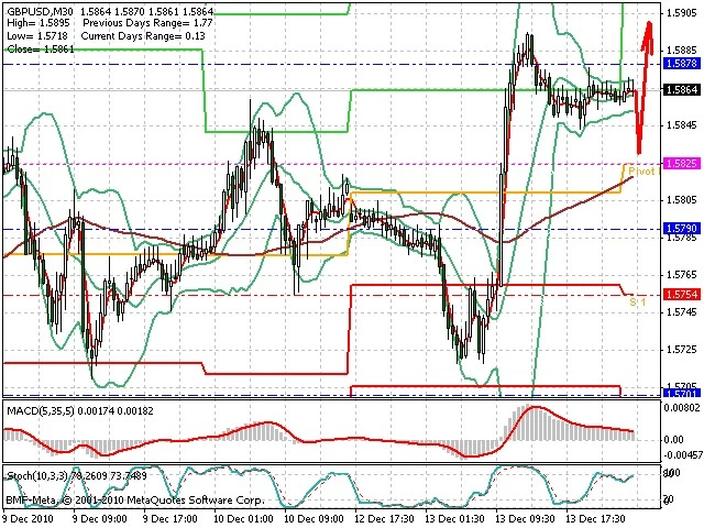 Předpokládaný pohyb pro dnešní den LONG. Případné vstupy do obchodu z hladiny 1.583 s předpokládaným cílem 1.59, případně až 1.5975. Proražení hladiny 1.582 může vést k pohybu s pravděpodobným cílem 1.5775 až 1.572.