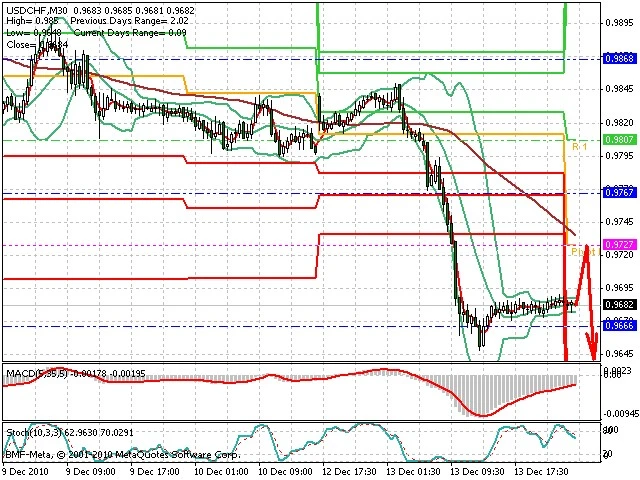 Předpokládaný pohyb pro dnešní den SHORT. Případné vstupy do obchodu z hladiny 0.9725 s předpokládaným cílem 0.965, případně až 0.962. Proražení hladiny 0.9725 může vést k pohybu s pravděpodobným cílem 0.9755 až 0.9795.