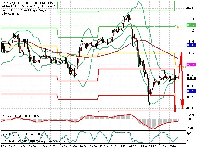 Předpokládaný pohyb pro dnešní den SHORT. Případné vstupy do obchodu z hladiny 83.8 s předpokládaným cílem 83.1, případně až 82.8. Proražení hladiny 83.85 může vést k pohybu s pravděpodobným cílem 84.1 až 84.4.