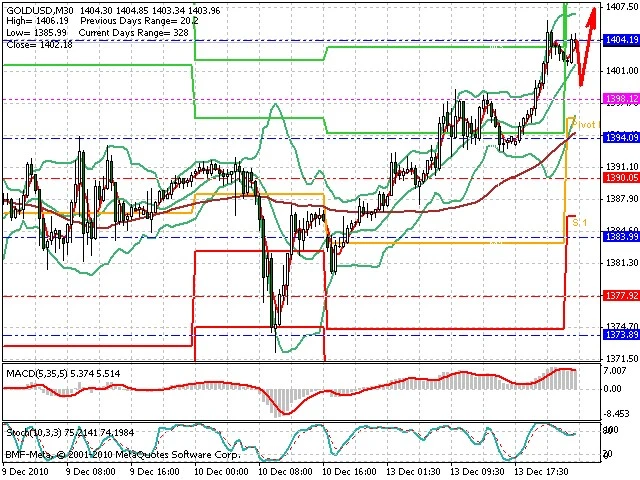 Předpokládaný pohyb pro dnešní den LONG. Případné vstupy do obchodu z hladiny 1 400 s předpokládaným cílem 1 411, případně až 1 425. Proražení hladiny 1 392 může vést k pohybu s pravděpodobným cílem 1 380 až 1 372.