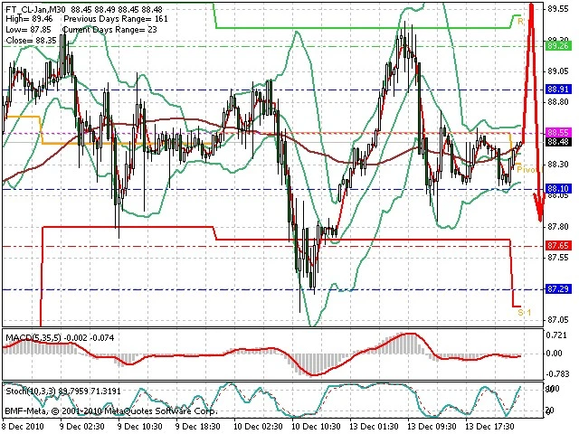 Předpokládaný pohyb pro dnešní den SHORT. Případné vstupy do obchodu z hladiny 90.0 s předpokládaným cílem 87.0, případně až 85.9. Proražení hladiny 90 může vést k pohybu s pravděpodobným cílem 91.8 až 93.4.