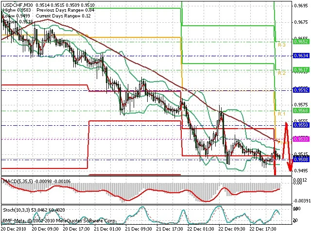 Předpokládaný pohyb pro dnešní den SHORT. Případné vstupy do obchodu z hladiny 0.9555 s předpokládaným cílem 0.95, případně až 0.946. Proražení hladiny 0.9555 může vést k pohybu s pravděpodobným cílem 0.96 až 0.965.