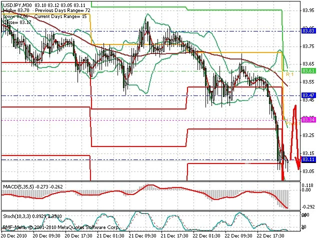 Předpokládaný pohyb pro dnešní den SHORT. Případné vstupy do obchodu z hladiny 83.4 s předpokládaným cílem 82.9, případně až 82.6. Proražení hladiny 83.45 může vést k pohybu s pravděpodobným cílem 83.75 až 83.95.