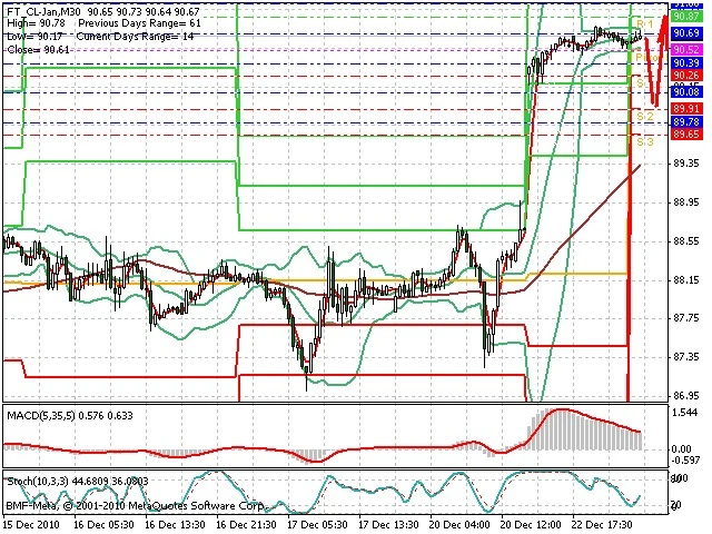 Předpokládaný pohyb pro dnešní den LONG. Případné vstupy do obchodu z hladiny 89.9 s předpokládaným cílem 91.2, případně až 91.55. Proražení hladiny 89.9 může vést k pohybu s pravděpodobným cílem 89.6 až 89.1.