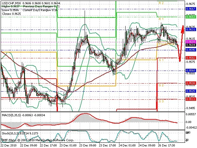 Předpokládaný pohyb pro dnešní den LONG. Případné vstupy do obchodu z hladiny 0.9575 s předpokládaným cílem 0.965, případně až 0.9695. Proražení hladiny 0.9575 může vést k pohybu s pravděpodobným cílem 0.954 až 0.95.