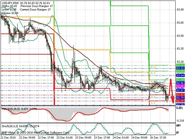 Předpokládaný pohyb pro dnešní den SHORT. Případné vstupy do obchodu z hladiny 83.0 s předpokládaným cílem 82.7, případně až 82.55. Proražení hladiny 83.0 může vést k pohybu s pravděpodobným cílem 83.2 až 83.4.