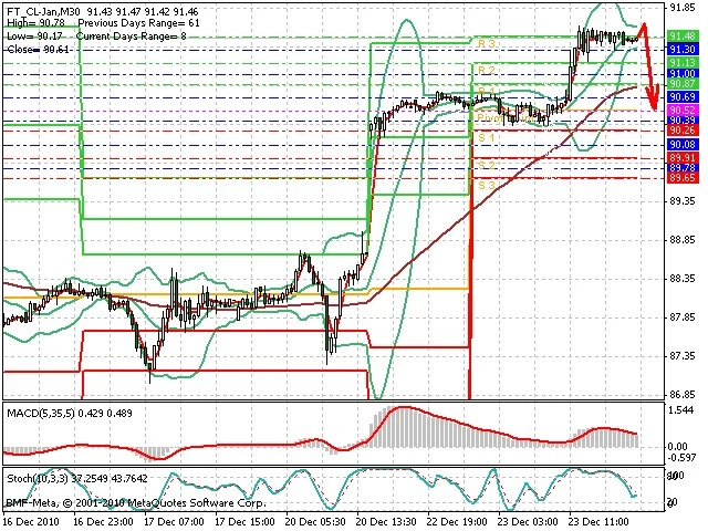 Předpokládaný pohyb pro dnešní den SHORT. Případné vstupy do obchodu z hladiny 91.63 s předpokládaným cílem 91.05, případně až 90.8. Proražení hladiny 91.63 může vést k pohybu s pravděpodobným cílem 92 až 92.2.
