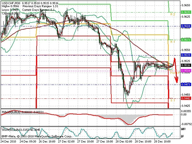 Předpokládaný pohyb pro dnešní den SHORT. Případné vstupy do obchodu z hladiny 0.9535 s předpokládaným cílem 0.947, případně až 0.9435. Proražení hladiny 0.9535 může vést k pohybu s pravděpodobným cílem 0.957 až 0.96.