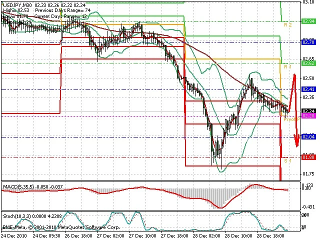 Předpokládaný pohyb pro dnešní den SHORT. Případné vstupy do obchodu z hladiny 82.55 s předpokládaným cílem 82.1, případně až 81.85. Proražení hladiny 82.55 může vést k pohybu s pravděpodobným cílem 82.85 až 83.0.