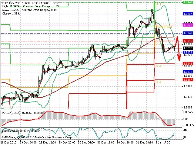 Předpokládaný pohyb pro dnešní den SHORT. Případné vstupy do obchodu z hladiny 1.3325 s předpokládaným cílem 1.325, případně až 1.32. Proražení hladiny 1.3335 může vést k pohybu s pravděpodobným cílem 1.3375 až 1.3425.