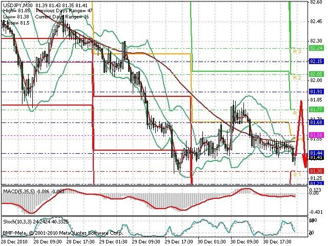 Předpokládaný pohyb pro dnešní den SHORT. Případné vstupy do obchodu z hladiny 81.45 s předpokládaným cílem 80.95, případně až 80.6. Proražení hladiny 81.5 může vést k pohybu s pravděpodobným cílem 81.85 až 82.05.