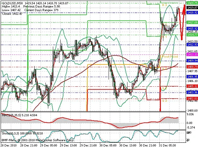 Předpokládaný pohyb pro dnešní den LONG. Případné vstupy do obchodu z hladiny 1 414 s předpokládaným cílem 1 425, případně až 1 427.5. Proražení hladiny 1 414 může vést k pohybu s pravděpodobným cílem 1 410 až 1 408.