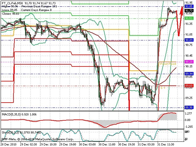 Předpokládaný pohyb pro dnešní den LONG. Případné vstupy do obchodu z hladiny 91.0 s předpokládaným cílem 92.95, případně až 93.2. Proražení hladiny 91.0 může vést k pohybu s pravděpodobným cílem 90.5 až 89.8.