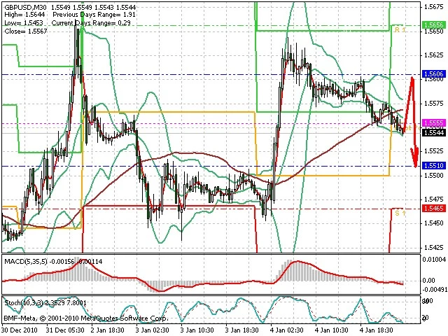 Předpokládaný pohyb pro dnešní den SHORT. Případné vstupy do obchodu z hladiny 1.561 s předpokládaným cílem 1.553, případně až 1.5475. Proražení hladiny 1.562 může vést k pohybu s pravděpodobným cílem 1.565 až 1.569.