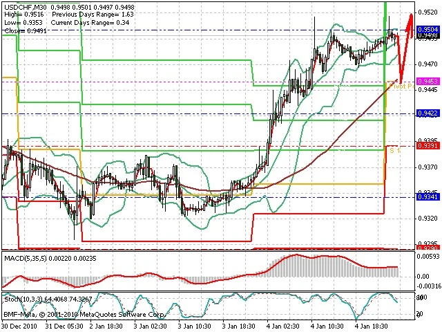 Předpokládaný pohyb pro dnešní den LONG. Případné vstupy do obchodu z hladiny 0.945 s předpokládaným cílem 0.9535, případně až 0.9575. Proražení hladiny 0.945 může vést k pohybu s pravděpodobným cílem 0.94 až 0.935.