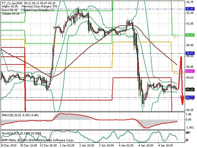 Předpokládaný pohyb pro dnešní den SHORT. Případné vstupy do obchodu z hladiny 90.5 s předpokládaným cílem 88.35, případně až 87.7. Proražení hladiny 90.5 může vést k pohybu s pravděpodobným cílem 91.25 až 92.