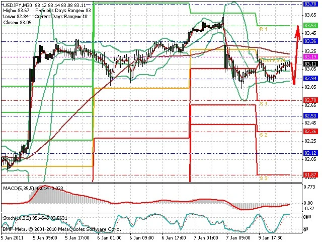 Předpokládaný pohyb pro dnešní den LONG. Případné vstupy do obchodu z hladiny 82.9 s předpokládaným cílem 83.3, případně až 83.5. Proražení hladiny 82.85 může vést k pohybu s pravděpodobným cílem 82.5 až 82.25.
