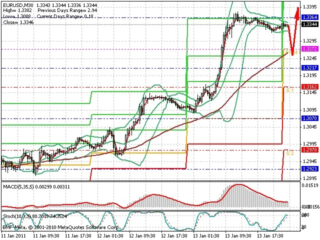 Předpokládaný pohyb pro dnešní den LONG. Případné vstupy do obchodu z hladiny 1.326 s předpokládaným cílem 1.338, případně až 1.344. Proražení hladiny 1.325 může vést k pohybu s pravděpodobným cílem 1.3185 až 1.314.