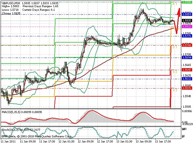 Předpokládaný pohyb pro dnešní den LONG. Případné vstupy do obchodu z hladiny 1.5785 s předpokládaným cílem 1.5885, případně až 1.5915. Proražení hladiny 1.5775 může vést k pohybu s pravděpodobným cílem 1.572 až 1.5675.