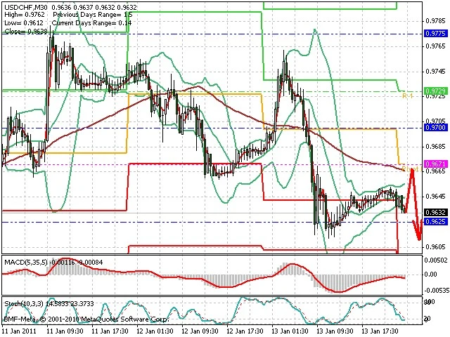Předpokládaný pohyb pro dnešní den SHORT. Případné vstupy do obchodu z hladiny 0.97 s předpokládaným cílem 0.96, případně až 0.955. Proražení hladiny 0.97 může vést k pohybu s pravděpodobným cílem 0.976 až 0.9785.