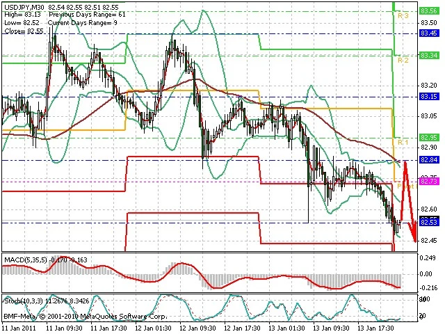 Předpokládaný pohyb pro dnešní den SHORT. Případné vstupy do obchodu z hladiny 82.85 s předpokládaným cílem 82.3, případně až 82.1. Proražení hladiny 82.9 může vést k pohybu s pravděpodobným cílem 83.15 až 83.5.