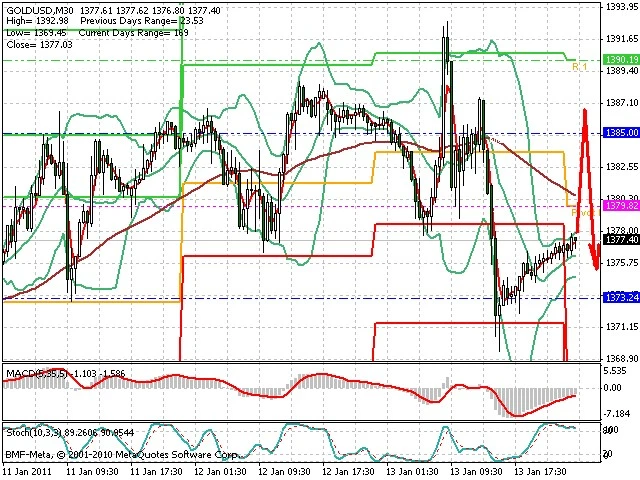 Předpokládaný pohyb pro dnešní den SHORT. Případné vstupy do obchodu z hladiny 1 387 s předpokládaným cílem 1 368, případně až 1 364. Proražení hladiny 1 387 může vést k pohybu s pravděpodobným cílem 1 392 až 1 400.